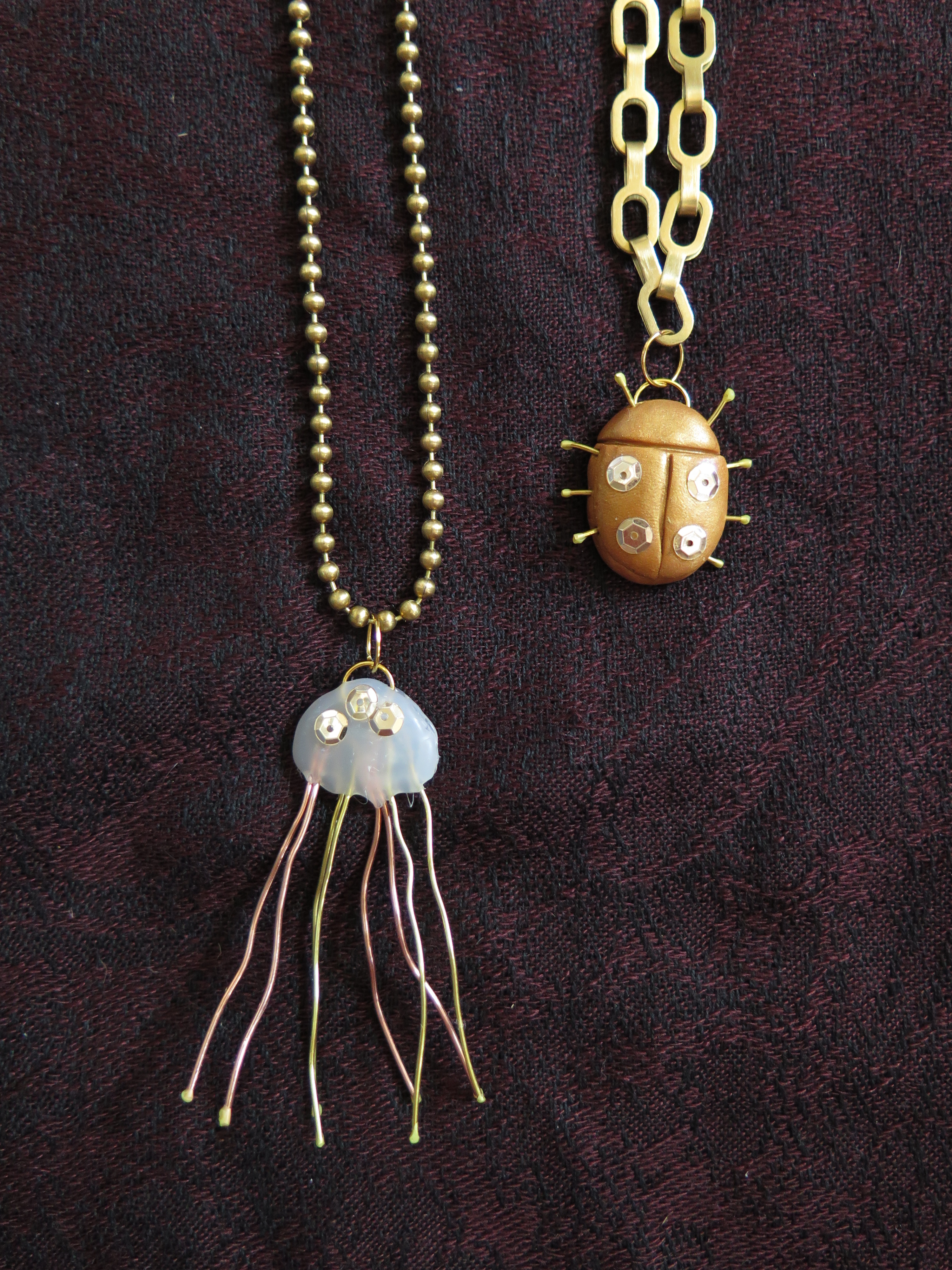 Jellyfish and beetle necklaces close-up